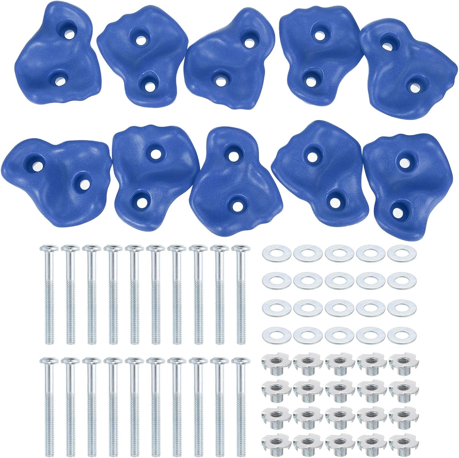 These rock climbing holds are suitable for outdoor playgrounds, tree houses, swing sets, backyard adventure zones. Meanwhile, indoors, they are good for jungle gyms, community centers, family activity zones, or indoor play areas.Advantage Weather-resistant and Durable: plastic holds withstand the sun, the rain, and heavy use without cracking or fading.Secure and Ergonomic: Sandblasted anti-slip grips and smooth edges ensure secure, comfortable climbing.Easy to Set Up: Includes screws and nuts for quick, tool-free installation.Vibrant and Fun: 5 bright colors and multiple shapes inspire creativity and active play.Instruction: Place the climbing holds on the climbing surface. Follow the attached instruction guide step by step, using the provided accessories. Each rock features a unique shape, allowing you to arrange them as you like to make the climbing experience fun. When properly installed, these rocks are very sturdy.NOTE: Please ensure adult supervision when using rock wall climbing holds and check them regularly for wear or defects. Ensure that the applied weight does not exceed 230 lbs.