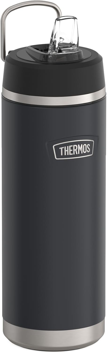 Cool start. Stay cool: reliably hydrated and refreshed for up to 12 hours with the Icon Water Bottle from Thermos. The insulated water bottle made of double-walled stainless steel accompanies with a linear look, smart carry handle and fold-out flip straw stylish through everyday life. Sometimes sporty in the gym, sometimes elegant in business, sometimes practical on trips - and always easy in the dishwasher. The non-slip base guarantees easy handling when filling: water and pour ice cubes over the large opening into the ICON WATER BOTTLE for the special kick, seal on it and be supplied with cold water throughout the day. As soon as the straw is folded down, nothing spills over even on the go. The ICON WATER BOTTLE is BPA free and extremely resistant thanks to True-Coat powder coating.